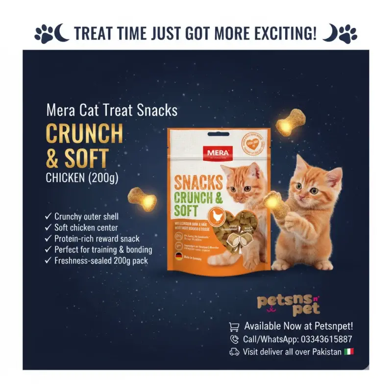 Delight your feline friend with the irresistible taste and exciting texture of Mera Cat Treat Snacks Crunch & Soft – Chicken (200g). You give your cat a treat that combines a crispy outer shell with a soft, savory chicken center, creating a snacking experience that captures attention instantly. Every bite delivers flavor, crunch, and satisfaction that keeps your cat coming back for more.