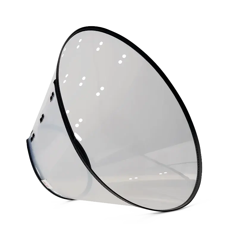 Made from lightweight, transparent, pliable materials, the e-collar forms a barrier around the pet’s neck, shielding wounds, incisions, and irritations.