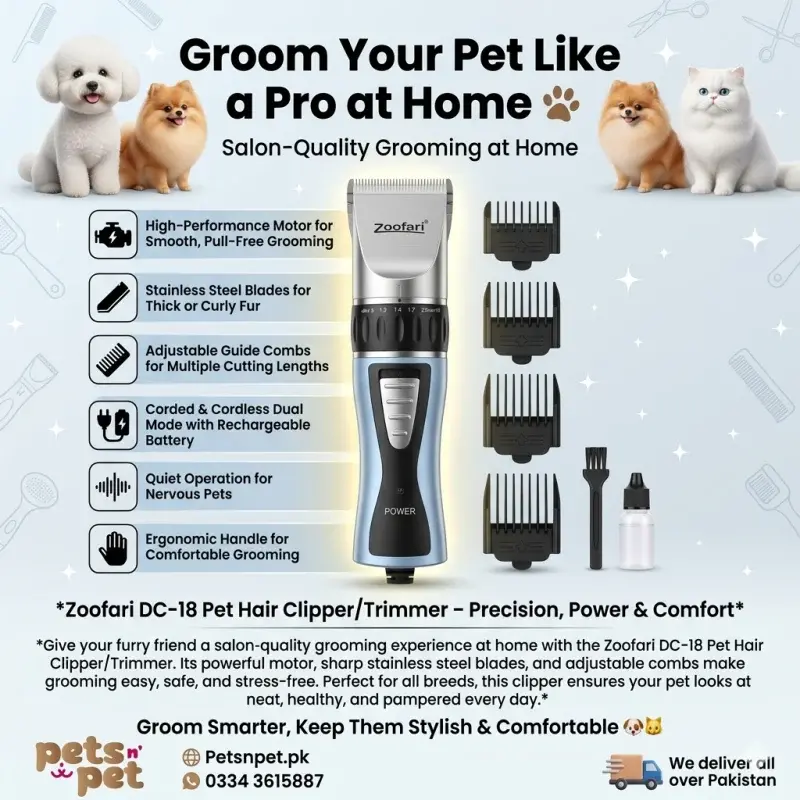 Perfect for home use or professional grooming, the Zoofari DC-18 Pet Hair Clipper/Trimmer ensures your furry friend always looks their best. Invest in convenience, performance, and your pet’s comfort with this top-tier grooming solution.